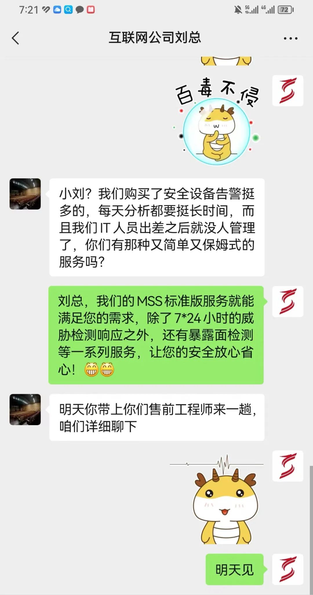 为客户提供轻量化的本地服务,快速联动本地安全设备,为用户在云端打造一个专属运营团队,提供7*24小时安全运营支撑。