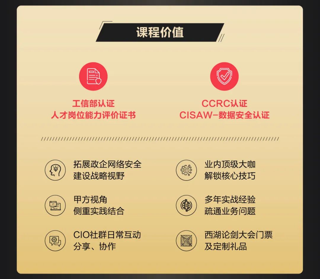 数字安全官高级研修班课程框架包括5大主题,10块课程安排,培训对象为党政军企网络安全工作的主管领导或主要负责人,旨在提升他们的网络安全建设战略思路与实践能力,限制30人。所有授课结束后将进行学员交流分享+讲师点评并做评优。此外,还会建立学员交流群,讲师入群,随时互动。