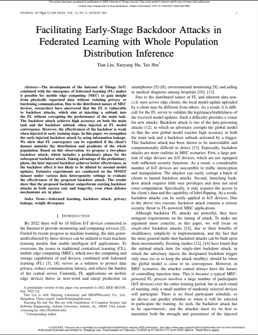 近日,由安恒信息博士后工作站的刘恬博士主导的针对联邦学习的安全攻击研究“FacilitatingEarly-Stage Backdoor Attacks in Federated Learning with Whole PopulationDistribution Inference”,被物联网领域国际顶级学术期刊《IEEE Internet of ThingsJournal》收录并在线发表。