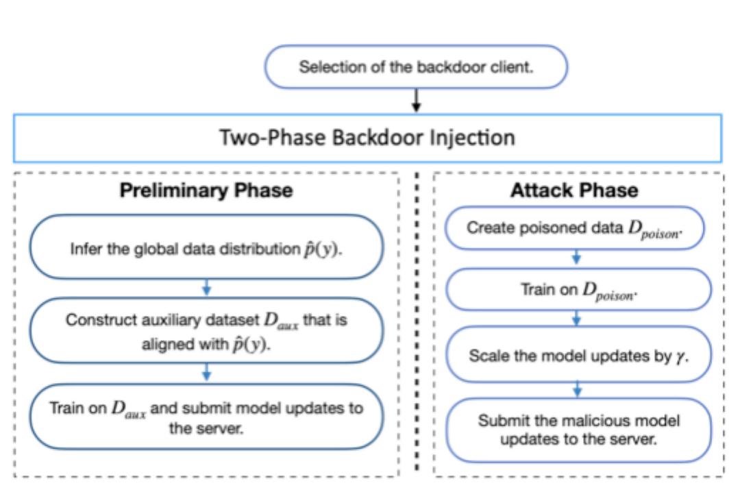 接着,研究提出了一个两阶段的后门攻击算法。在第一阶段(准备阶段),攻击者发起对全局数据分布的推理攻击,通过使本地数据分布与全局数据分布对齐,促进全局模型的收敛。在第二阶段(攻击阶段),攻击者发起常规的后门攻击。该攻击通过向本地数据添加“后门”并翻转数据标签,将在注入数据上训练的模型发送到中心服务器。