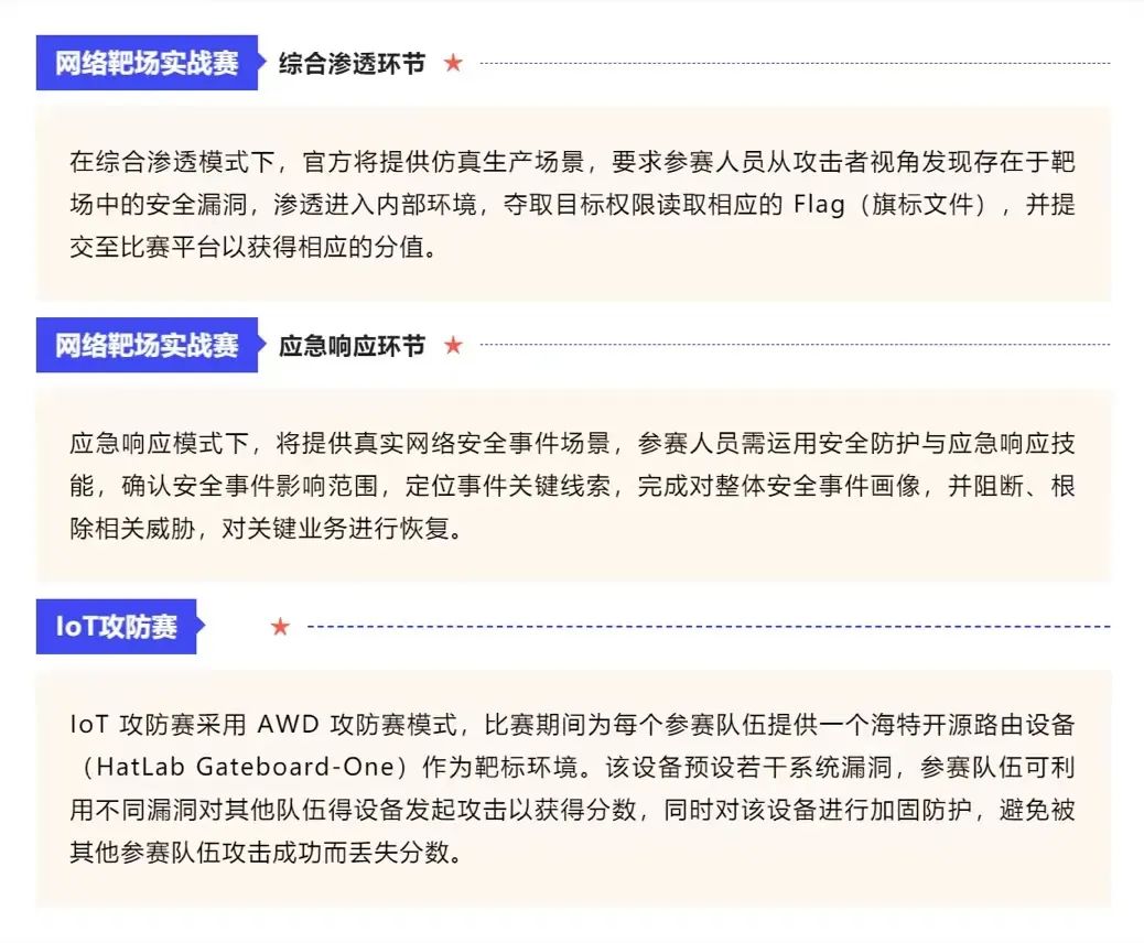 在本届大赛网络靶场实战赛赛项中,将通过仿真的网络空间靶场,构建模拟的真实业务与事件场景,综合考察参赛选手的网络攻击与防护能力,助力培养产业急需的知攻善防、一专多能的实战型网络安全技术人才,提高网络安全团队协同作战水平。线下决赛将突破网络层安全竞技,将攻防视角引入硬件层面,网络靶场实战赛、IoT攻防赛两大赛项同场PK。网络靶场实战赛(综合渗透环节&应急响应环节)、IoT攻防赛,两个赛项的得分合计为总排名。
