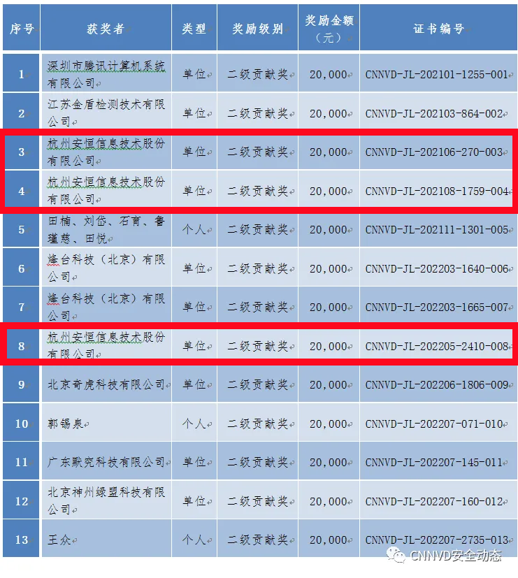 近期,国家信息安全漏洞库(CNNVD)开展了2022年度接报漏洞奖励评选工作,其中13个漏洞在我国网络安全漏洞预警及风险消控工作中发挥了积极作用,获得“二级贡献奖”。