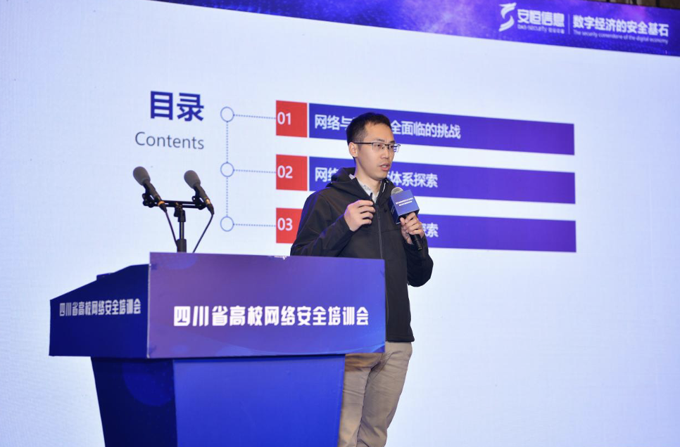 会上,安恒信息高级副总裁杨勃发表了《教育行业网络与数据安全运营体系实践》主题演讲,介绍了安恒信息多年来从工具到产品再到平台,从渗透到驻场再到通过安全托管运营服务为用户解决安全问题的成长历程。