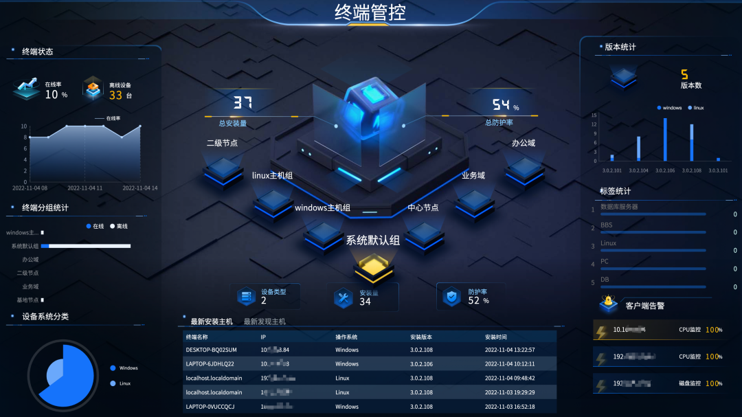 主机监控与审计能力:以主机管理为核心,形成集主机监控与审计、补丁管理、运维管理等为一体的主机审计系统,为企业管理者提供内网主机统一管理解决方案,最大程度杜绝终端违规操作,帮助使用者创建一个安全、可靠、稳定、合规的内网办公环境。