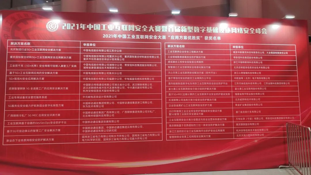 会议期间还公布了2021年中国工业互联网安全大赛“应用方案优胜奖”,安恒信息申报的两个项目从众多方案中脱颖而出,双双获奖。