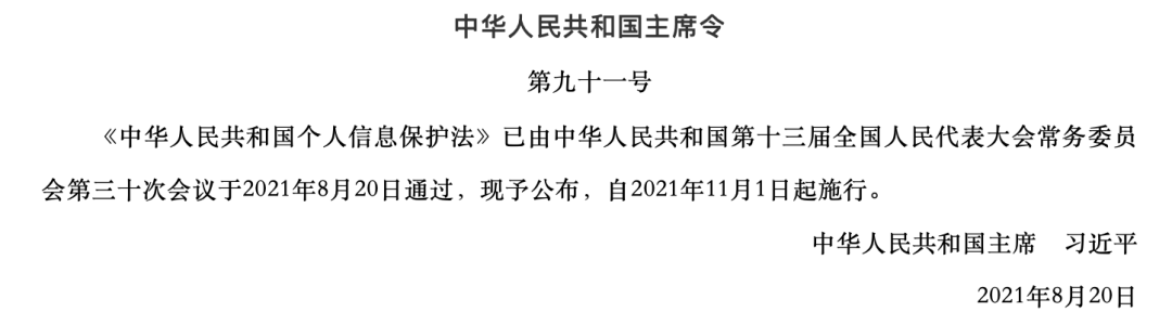 8月20日,十三届全国人大常委会第三十次会议表决通过《中华人民共和国个人信息保护法》,自2021年11月1日起施行。