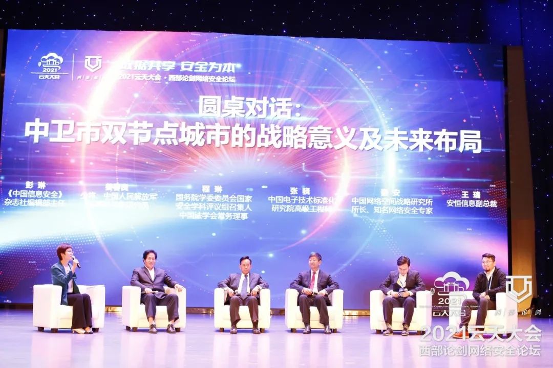 在圆桌对话环节,安恒信息副总裁王瑞同中国人民解放军少将、军事科学院研究员姜春良,中国法学会常务理事、中国人民公安大学原党委书记、校长程琳,中国电子技术标准化研究院高级工程师张骁,中国网络空间战略研究所所长秦安和等嘉宾,围绕中卫市双节点城市的战略意义及未来布局展开积极探讨。