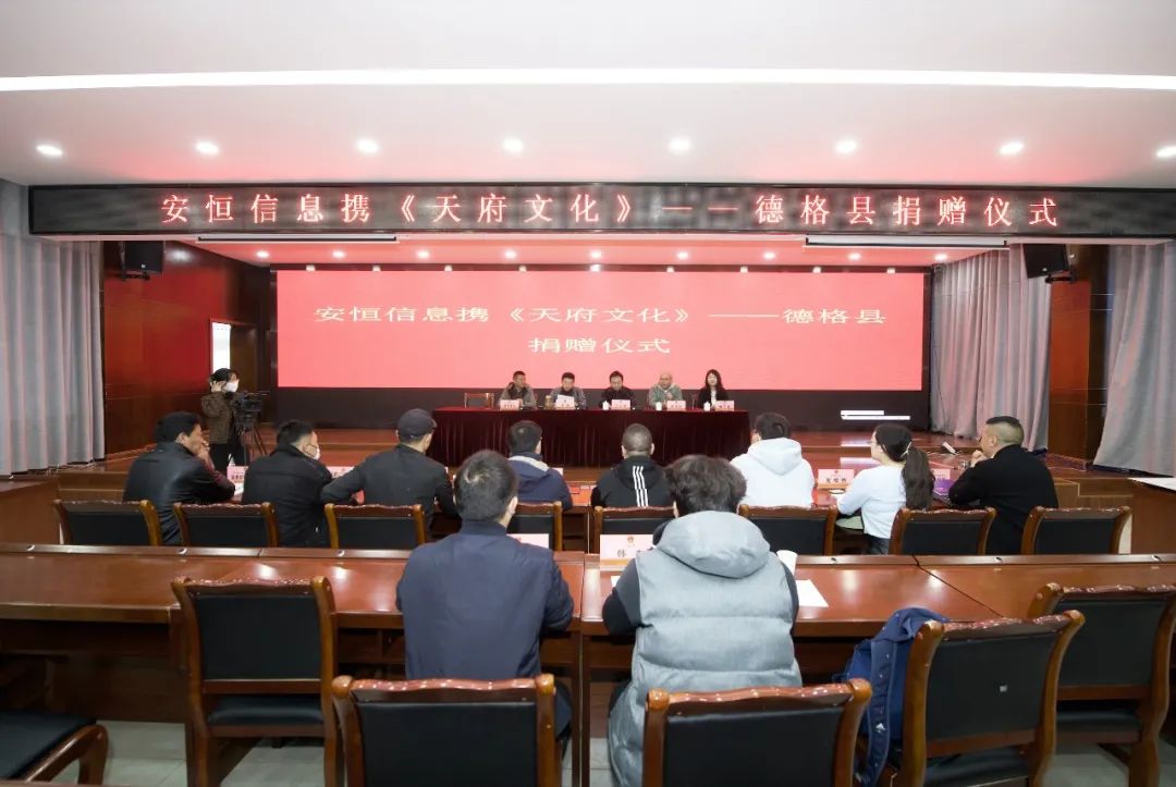德格县副县长根机夏拉、德格县政府办主任拥忠扎西、德格县教体局局长向秋扎西、德格县卫健局局长陈明才,安恒信息高级副总裁、成都安恒公益慈善基金会理事长吴永越,天府文化执行总编辑、成都安恒公益慈善基金会理事苑海辰,联想集团投资总监、成都安恒公益慈善基金会理事李志,联想集团中国平台总监赵强,安恒信息高级副总裁、成都安恒公益慈善基金会副理事长段平霞,成都安恒信息技术有限公司副总经理冯佳坤,成都安恒公益慈善基金会秘书长夏欣然,以及成都高新区(简阳市)对口支援工作队代表等出席本次捐赠仪式。德格县委常委、副县长徐磊主持捐赠仪式。