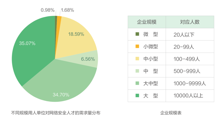 从用人单位规模维度出发,万人规模以上大型企业对于网安类人才需求最高,为35.70%。值得注意的是,百人规模以上的中型企业和中小型企业,对于网络安全人才的需求,近三年来以每年接近3个百分点的增幅在不断提高,表明自2019年网络安全等级保护制度2.0标准正式发布后提高了对中小型机构的安全等级,中小企业、民营企业——经济社会中数量最多的主体的安全需求正在逐步提升。