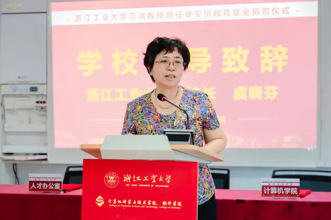 仪式上,虞晓芬副校长代表学校向安恒信息长期以来对浙江工业大学和计算机科学与技术学院、软件学院发展的关心支持表示感谢,并向他们介绍了学校的基本情况。她指出,范渊董事长热心高等教育事业,向学校慷慨捐资,彰显了企业家关心教育、回报社会的责任和担当,并提出了未来双方深入合作共同培养优秀网安人才的美好愿景。