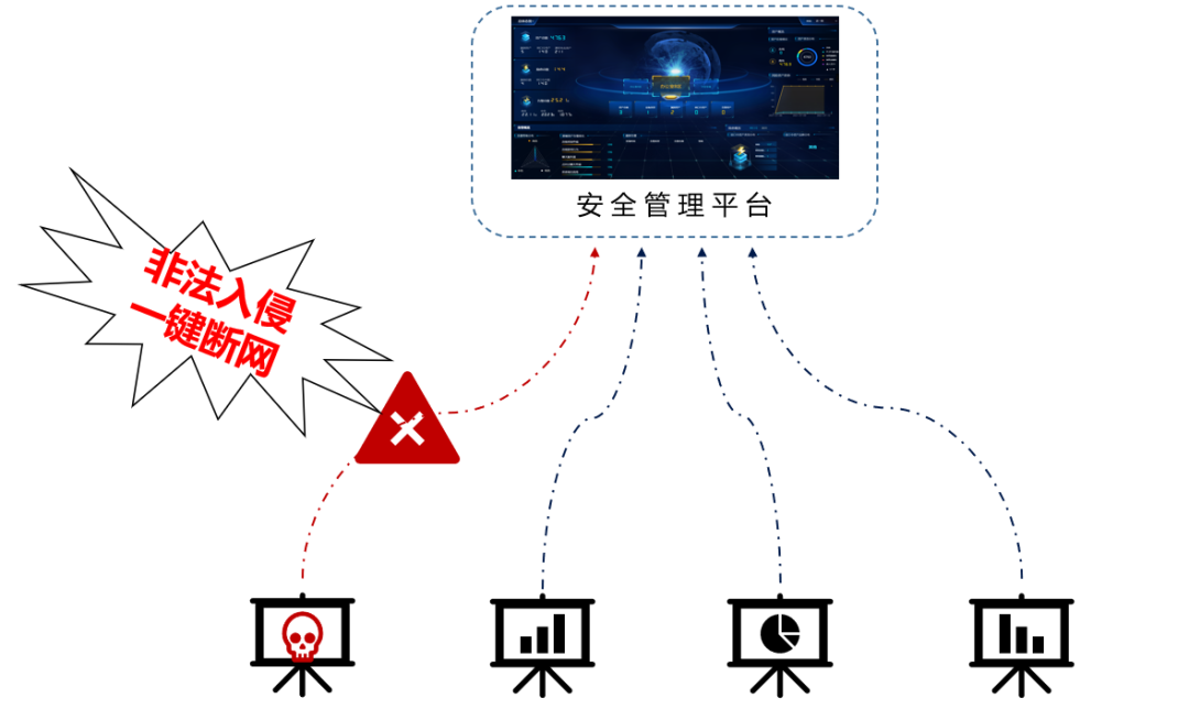 针对海量显示屏终端遭受非法入侵进而散播不良言论等风险行为,可迅速定位异常显示屏终端,进而通过平台下发一键断网指令,及时控制不良信息的传播,减少此类恶意行为所带来的危害。