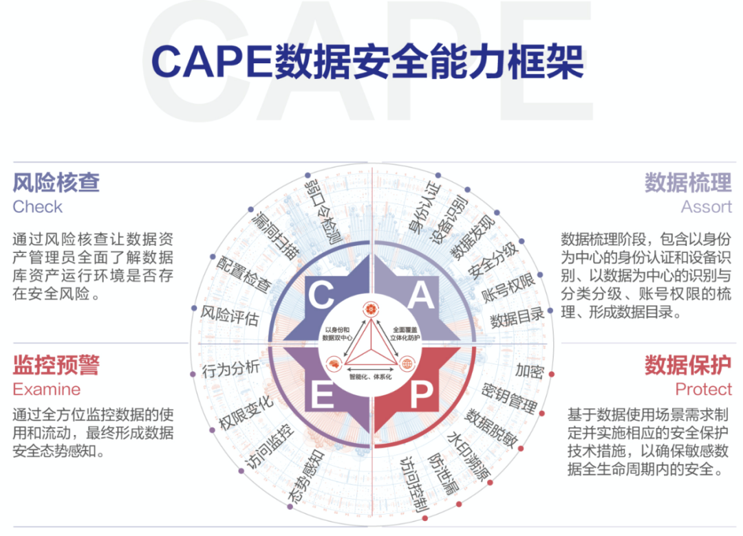 数据安全技术体系:构建风险核查(Check)、数据梳理(Assort)、数据保护(Protect)以及数据威胁监控预警(Examine)四位一体的数据安全技术体系,实现对数据采集、传输、存储、处理、交换、销毁全生命周期的安全管理和防护。