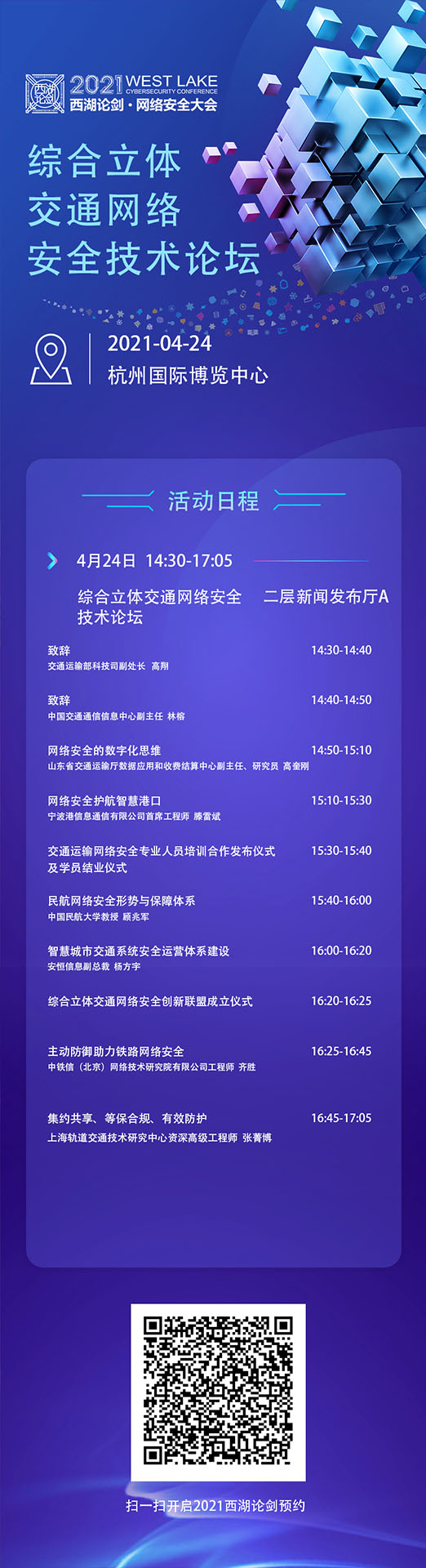 在“十四五”规划“加快建设交通强国,完善综合运输大通道、综合交通枢纽和物流网络,加快城市群和都市圈轨道交通网络化”的号召下,2021西湖论剑·网络安全大会聚焦综合立体交通运输行业的网络安全发展重点,设立由交通运输部科技司指导、中国交通通信信息中心主办的综合立体交通网络安全技术论坛,以“综合立体交通发展 安全赋能”为主题,探讨国内外双循环发展新格局,提出综合交通发展面临的挑战和对策,推动交通运输行业网络安全技术与产业的健康发展。