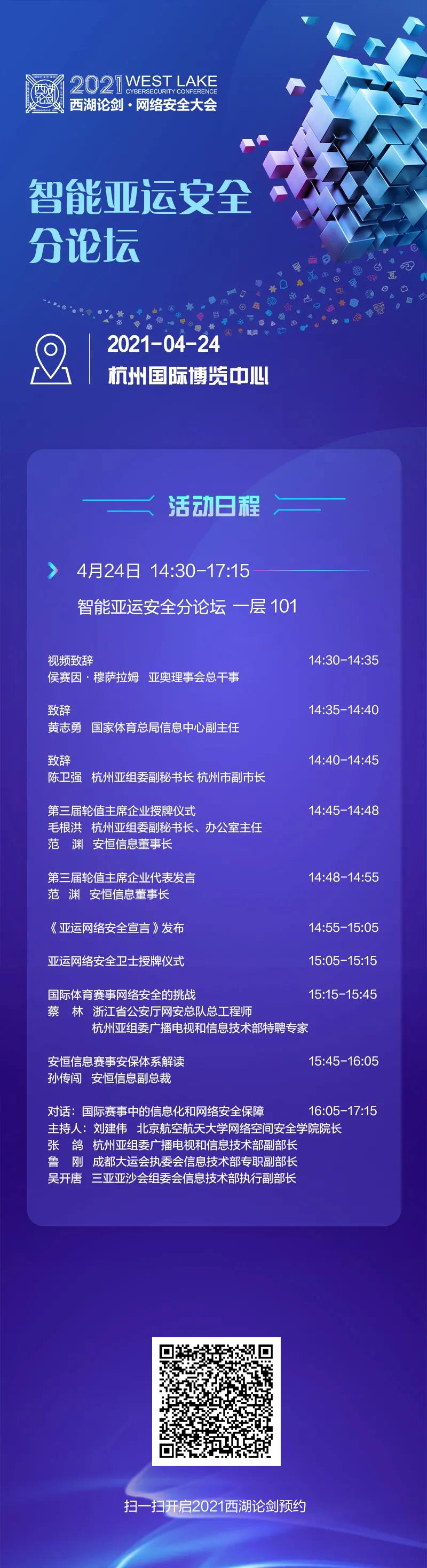 2021年4月24日,2021西湖论剑•网络安全大会新增智能亚运安全分论坛,这是首个聚焦赛事网络安全服务的盛会,邀请了国内外知名专家为亚运网络安全建言献策。在现场,将由亚奥理事会总干事远程视频连线致辞。