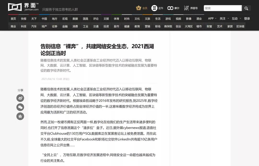 界面新闻|告别信息“裸奔”,共建网络安全生态,2021西湖论剑正当时