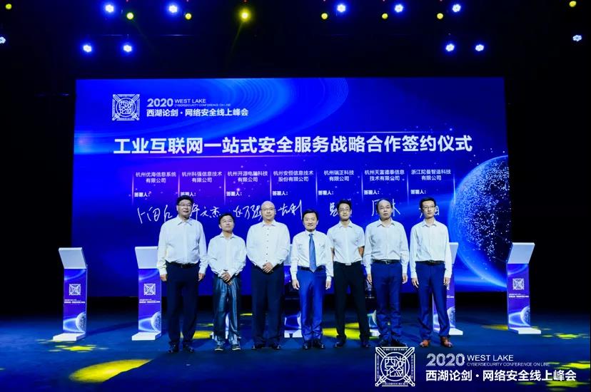 在西湖论剑工业互联网分论坛上,安恒信息与多家企业签订工业互联网一站式安全服务战略合作。