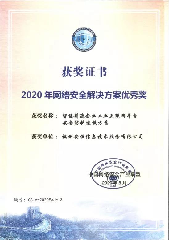 凭借“智能制造企业工业互联网平台安全防护建设方案”获得2020年网络安全解决方案优秀奖。