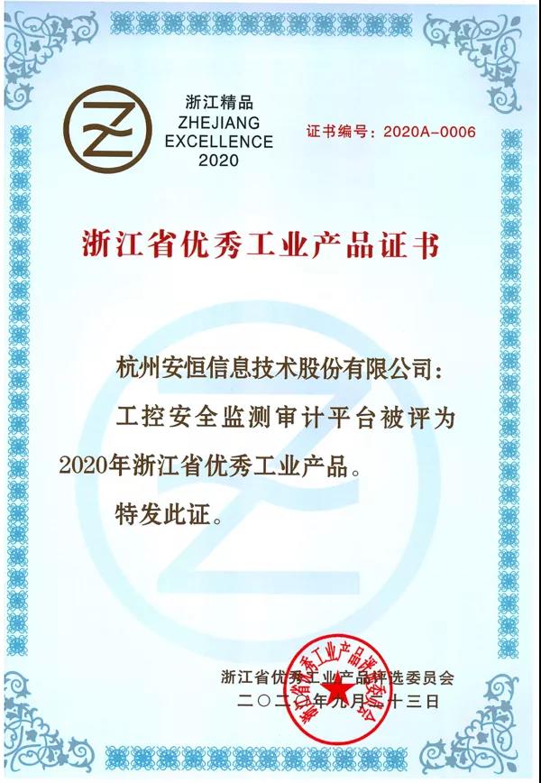 安恒工控安全监测审计平台获评“浙江省优秀工业产品”。