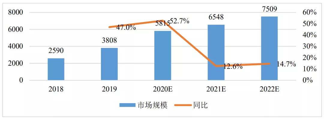 AIoT产业是多种技术融合,赋能各行业的产业,整体市场潜在空间超十万亿元。艾瑞咨询数据显示,2019年中国AIoT产业总产值为3808亿元,预计2020年达5815亿元,同比增长52.7%,高增长主要得益于5G等新技术规划化商用和AIoT应用在消费和公共事业等领域大规模落地。未来三年,在消费端和政策驱动端应用市场的继续推动下,AIoT产业仍将保持高速增长。长期来看,产业驱动应用市场潜力巨大,将成为远期增长点。