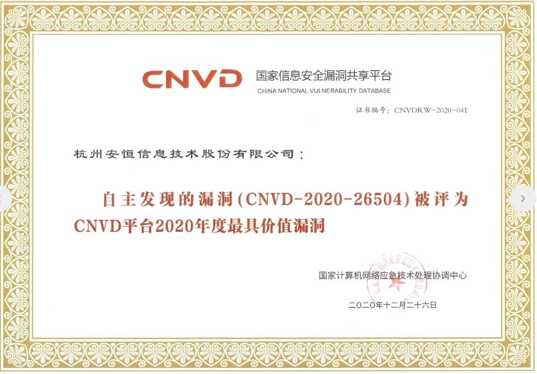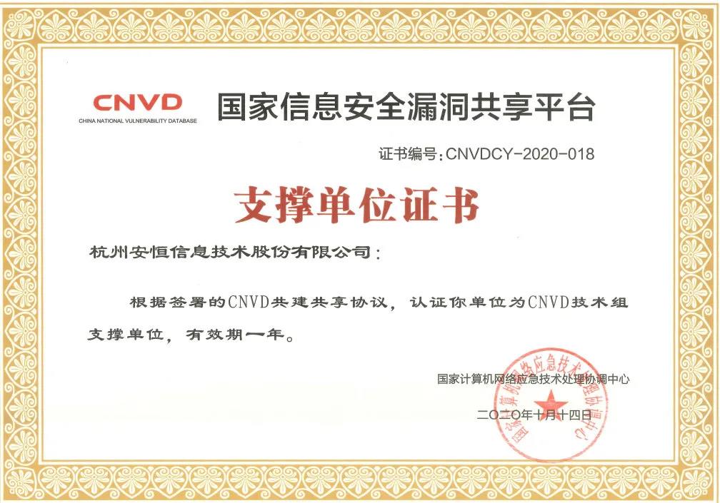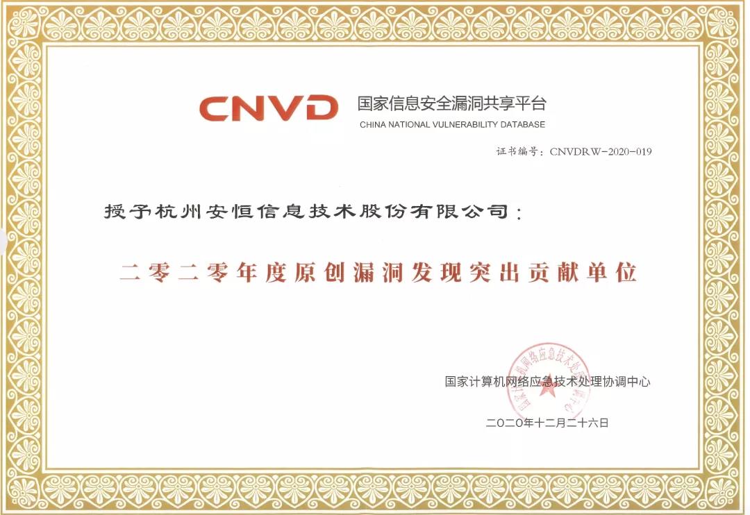 两项荣誉 一项证书,安恒信息再次荣获CNVD表彰