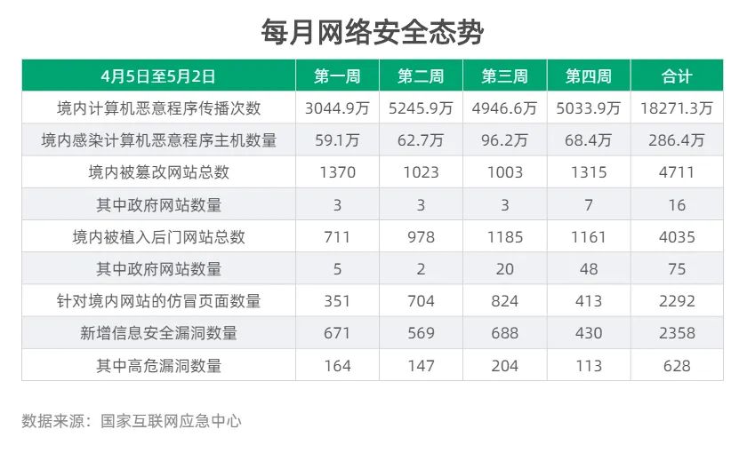 数据显示,4月5日~5月2日期间,境内计算机恶意程序传播次数共超过1.8亿次,传播速度从第二周开始猛增,较第一周上涨2000多万次,涨幅72.28%。