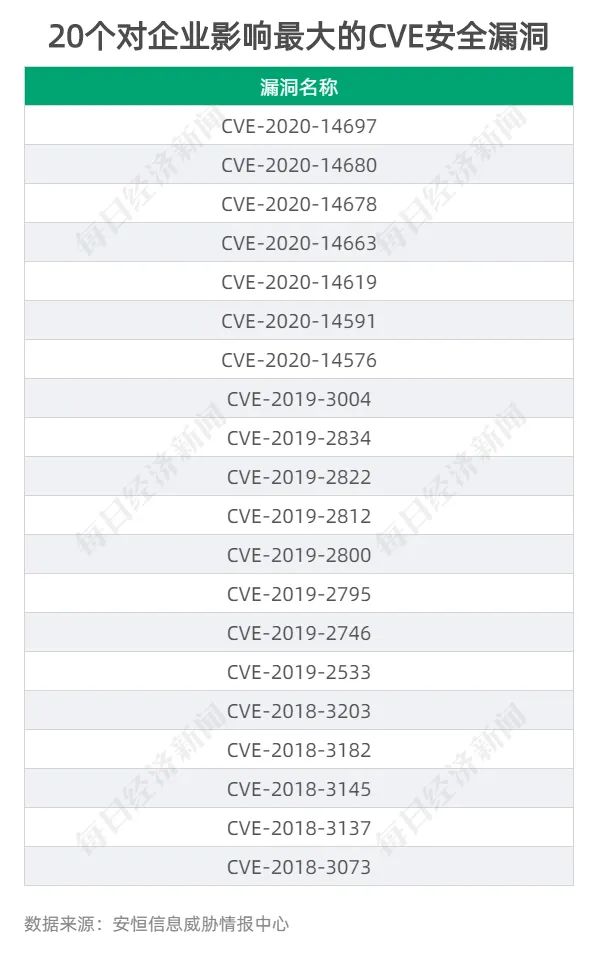 2021年一季度,在受到影响的159家A股上市公司中,有121家上市公司受到大于2个CVE的影响。2021年一季度,以下20个CVE安全漏洞对企业的影响最大:
