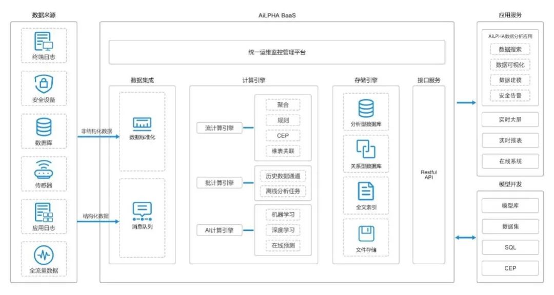 安恒AiLPHA大数据智能安全平台,是网络安全大数据领域十分优秀的产品和应用解决方案,其内部集成着:超大规模数据存查、大数据实时智能分析、威胁情报碰撞、全网流量处理、复杂事件实时处理等功能,更具备了流计算任务监控管理、安全模型定制化开发与编排管理、ES及kafka运维监控管理、语法统一与转换功能。