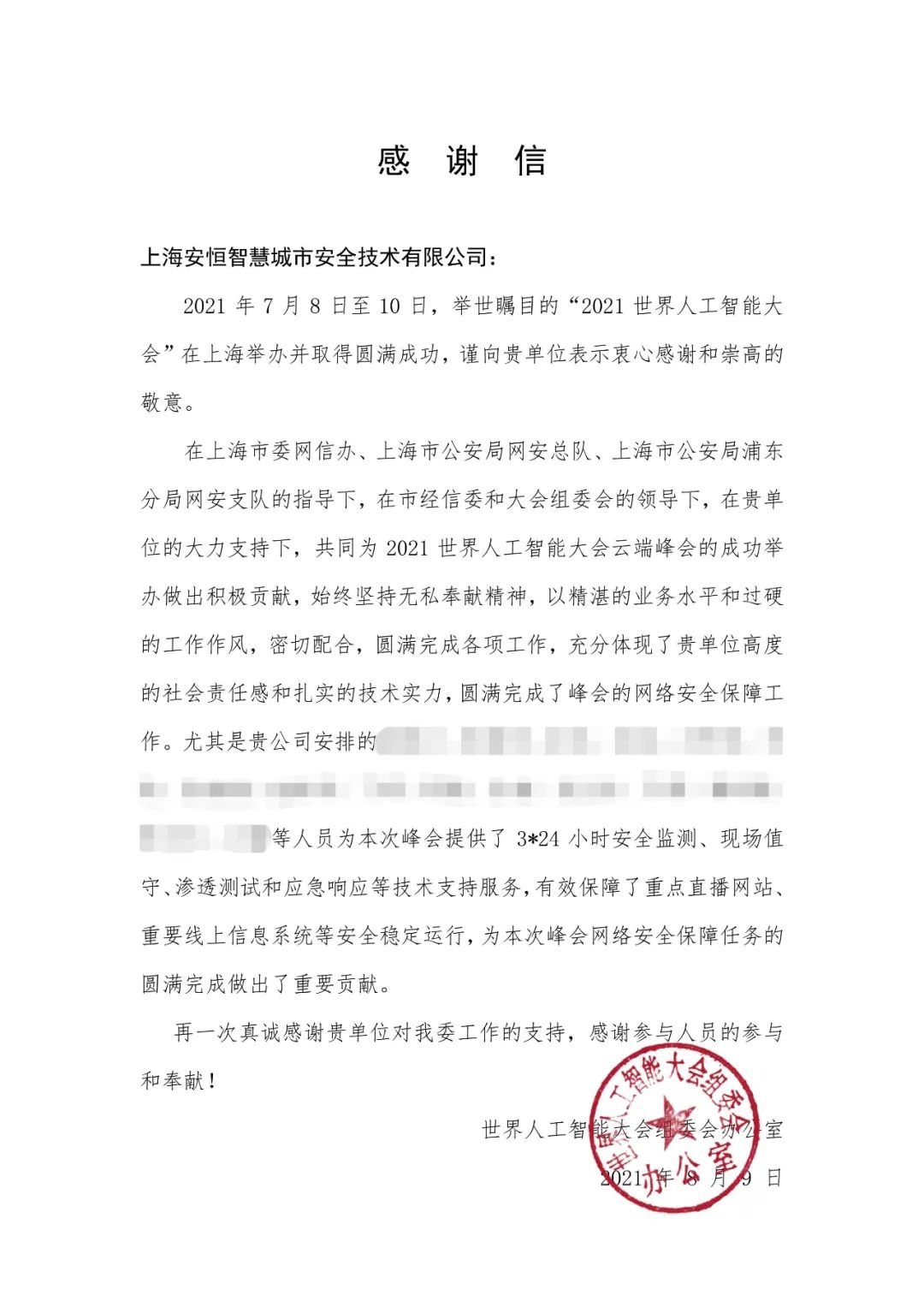 8月9日,2021世界人工智能大会组委会向安恒信息发来感谢信。