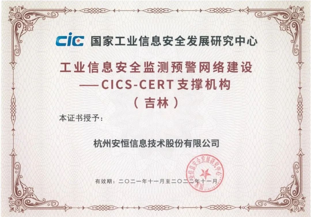 经过层层评审环节,安恒信息在本年度大会上成功入选2021至2022年度吉林省的国家工业信息安全监测预警网络建设——CICS-CERT支撑单位。作为支撑单位,安恒信息将在吉林省开展省内工业信息安全监测预警支撑工作,积极参与网络节点平台的研发、部署、运营等工作,为地方提供必要的人员和技术支持,并配合国家工业信息安全发展研究中心开展风险研判、处置验证等工作,以合作方式共建国家工业信息安全监测预警网络。