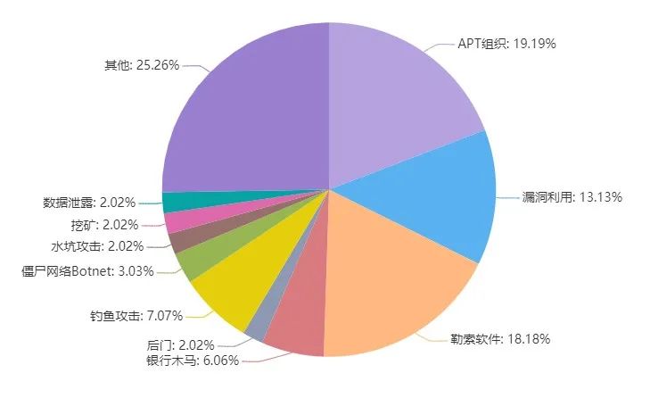 按照攻击类型,其中APT攻击比例最高为19.19%,勒索软件收录占比第二,为18.18%。