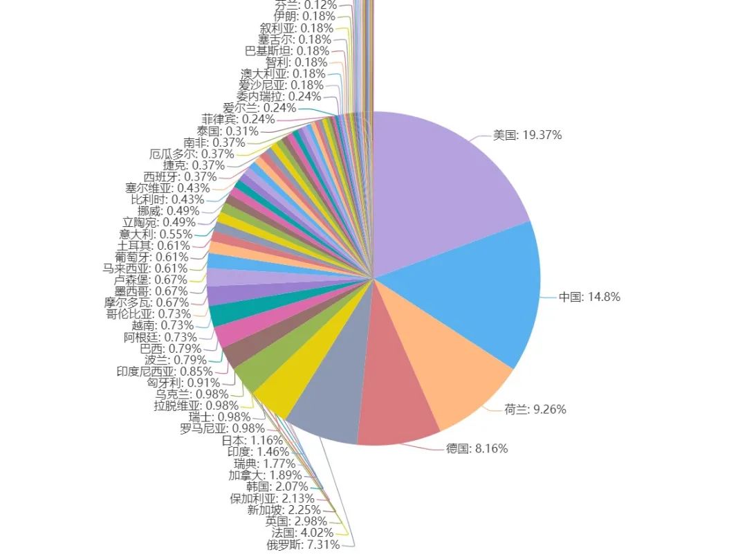安恒威胁情报中心针对11月恶意IP情报进行分析,整理出11月恶意IP资产分布地图,其中在全球分布地图中,恶意IP最多的前10个国家分别为美国、中国、荷兰、德国、俄罗斯、法国、英国、新加坡、保加利亚、韩国。其中美国的恶意IP情报最高,占所有资产19.37%。
