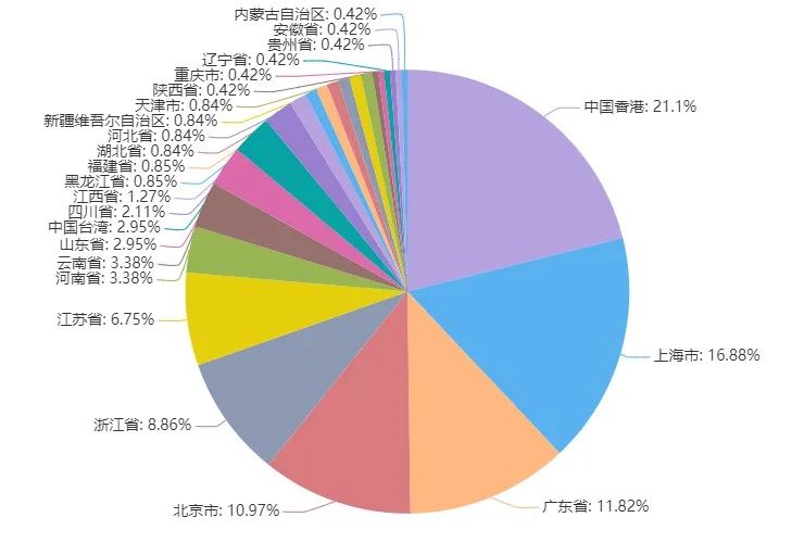 以中国的省市分布来看,IP恶意情报分布排名前5的分别为中国香港、上海、广东、北京、浙江,其中中国香港的恶意IP占比最高,为21.1%。