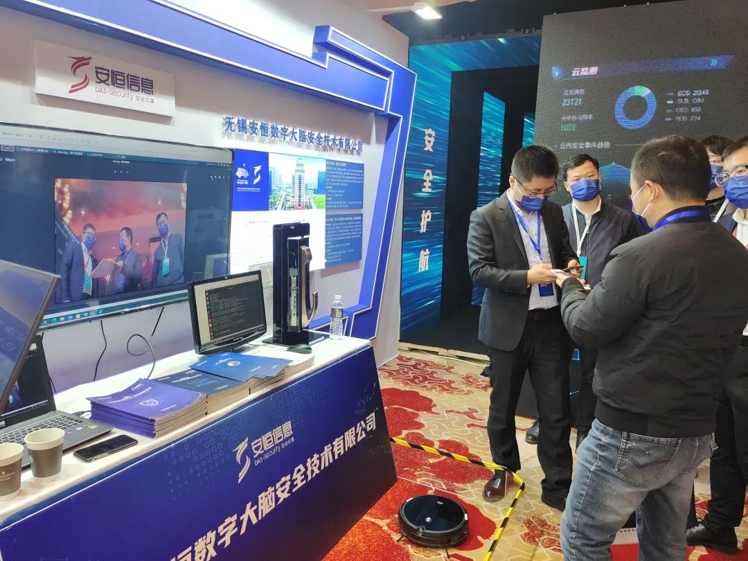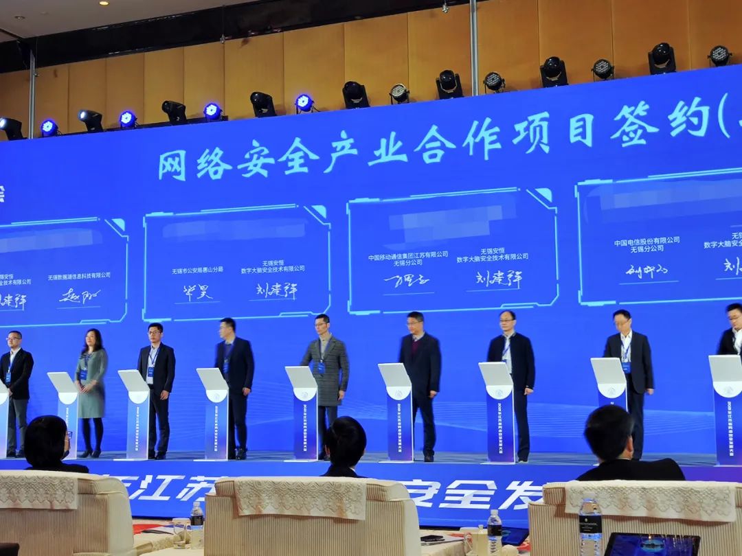 大会网络安全产业项目合作签约环节,安恒信息与无锡市公安局惠山分局、江苏移动无锡分公司、中国电信股份有限公司无锡分公司、无锡数据湖信息科技有限公司共同登台签约。