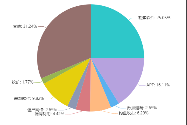 按照攻击类型,其中勒索软件比例最高为25.05%,APT攻击收录占比第二,为16.11%。