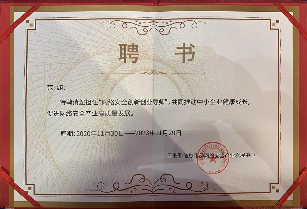 工业和信息化部网络安全产业发展中心在工业和信息化部网络安全管理局的指导下,根据网络安全产业发展需要、候选人资历和网络投票等多维度评选,选聘安恒信息董事长范渊为“首批网络安全创新创业导师”,并现场为获奖导师颁发聘书。
