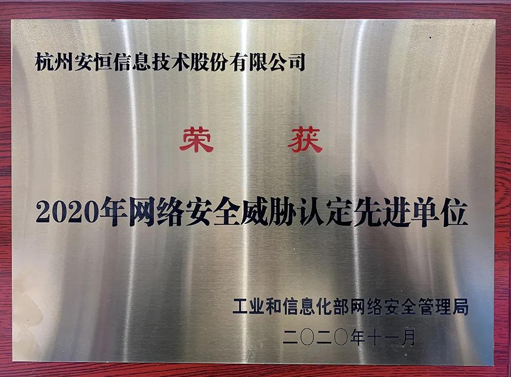 本届高峰论坛同时举行了2020年网络安全响应支撑先进单位授牌仪式。安恒信息凭借在网络安全威胁监测处置工作中发挥了积极作用,荣获“网络安全威胁认定先进单位”称号。