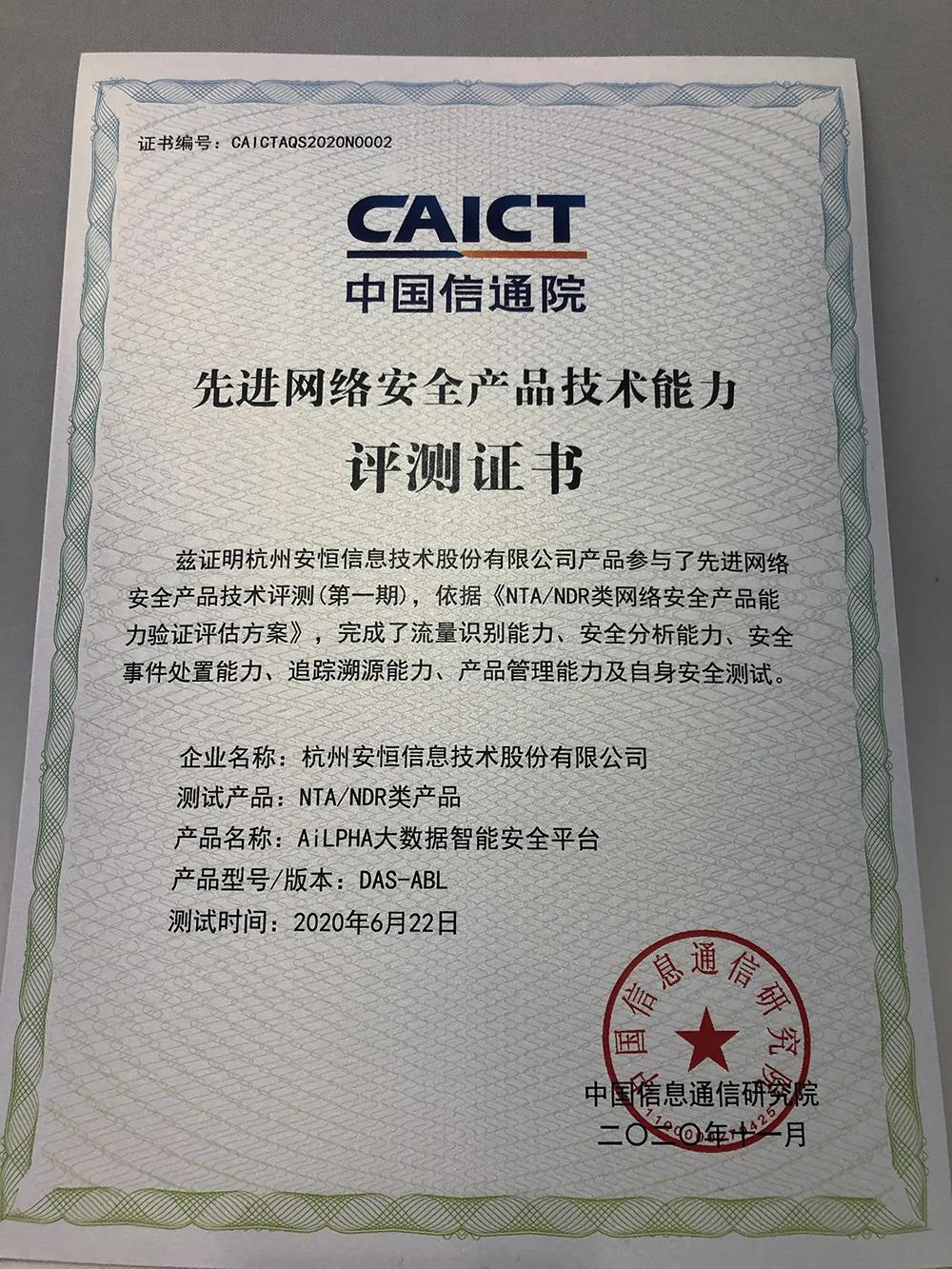 安恒信息AiLPHA大数据智能安全平台参与了先进网络安全产品技术评测(第一期),依据《NTA/NDR类网络安全产品能力验证评估方案》,完成了流量识别能力、安全分析能力、安全事件处置能力、追踪溯源能力、产品管理能力及自身安全测试,获得由信通院为安恒信息颁发的“先进网络安全技术能力测评证书” 。