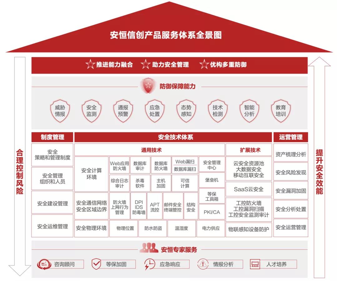 作为网络安全行业领先企业之一,安恒信息高度重视信息技术应用创新,紧跟国家在核心技术创新方面的步伐,在信创生态下已形成一套集安全软硬件、安全服务、安全集成的完整解决方案,不仅实现了安全计算环境、安全通信网络、安全区域边界等通用技术体系,同时在大数据安全、云安全等扩展技术能力上也具备信创生态。通过与客户安全能力的融合,协助客户构建完整的检测、发现、处置、回 溯网络安全生命周期的主动防御机制以及动态的安全管理运维中心,共同构建从外部到内部的立体多重防御体系。