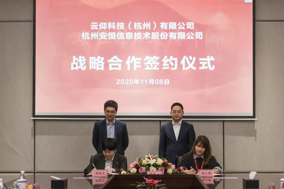 近日,云仰科技与安恒信息在杭州签署战略合作协议,将面向城市大脑、安全等领域,利用大数据、人工智能等技术和产品,推动智慧城市安全建设。