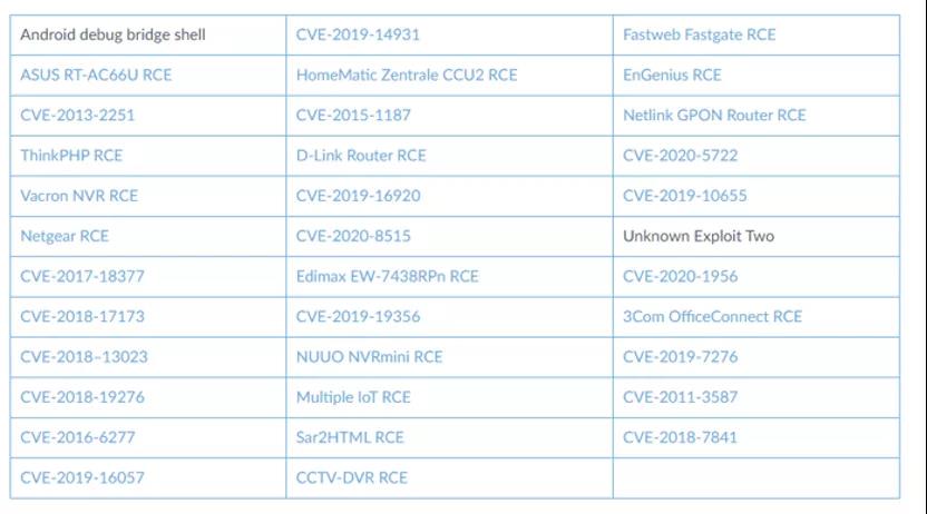 尽管这些变种没有完全相同的来源和配置,但它们都具有发起DDoS攻击所需的功能。变种4更危险,它具有其他3个变种没有的感染能力。下表总结了此特定Mirai变种用于感染其他脆弱主机的漏洞: