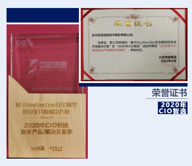 近日,中央专业媒体集团计世传媒推出了“2020 CIO领航计划”暨“复工复产复学”优秀案例征集大型活动”。安恒信息凭借DevSecOps安全模型的安全开发解决方案,荣获「2020年CIO智选安全产品/解决方案奖」,共同入选的还有华为、钉钉、京东物流等企业。