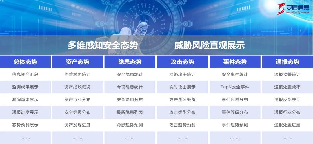 安恒信息的态势感知平台是面向具有网络安全监管需求用户的综合性解决方案。平台通过采集系统应用漏洞、安全设备告警、运维日志、网络资产、第三方威胁情报,配合实时全流量分析监测,结合大数据技术、机器学习、数据建模、关联分析等方法对多源异构数据进行综合分析,形成对网络安全全面的态势感知分析。