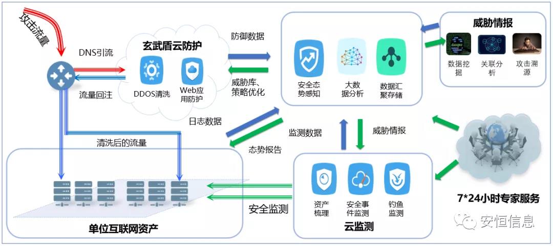 安恒玄武盾云防护服务借助DNS引流技术,将互联网资产的访问流量引到云端防护平台,从DDoS、Web防护、CC等方面进行7*24小时安全防护,同时结合云端专家及联动云端威胁情报,持续对安全规则进行调优,实现全面精准拦截恶意攻击。