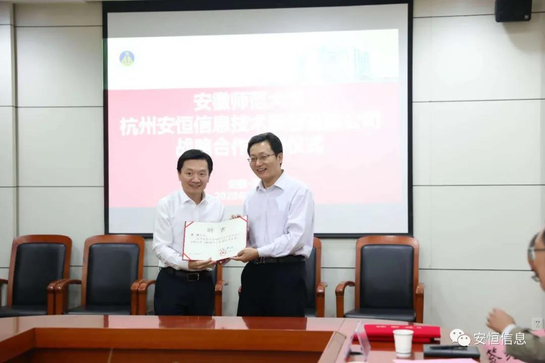 签约仪式上,安恒信息董事长范渊正式受聘为安徽师范大学计算机与信息学院兼职教授,安徽师范大学党委副书记、校长张庆亮颁发聘书。