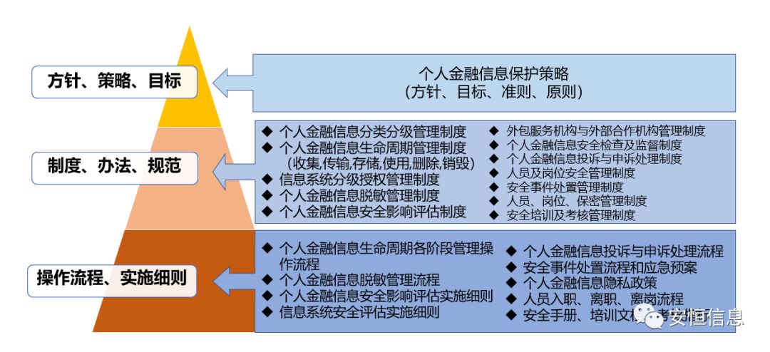 《规范》将个人金融信息按敏感程度、泄露后造成的危害程度,从高到低分为C3、C2、C1三个类别;同时,规定了个人金融信息在收集、传输、存储、使用、删除、销毁等生命周期各环节的安全防护要求,从安全技术和安全管理两个方面,对个人金融信息保护提出了规范性要求。