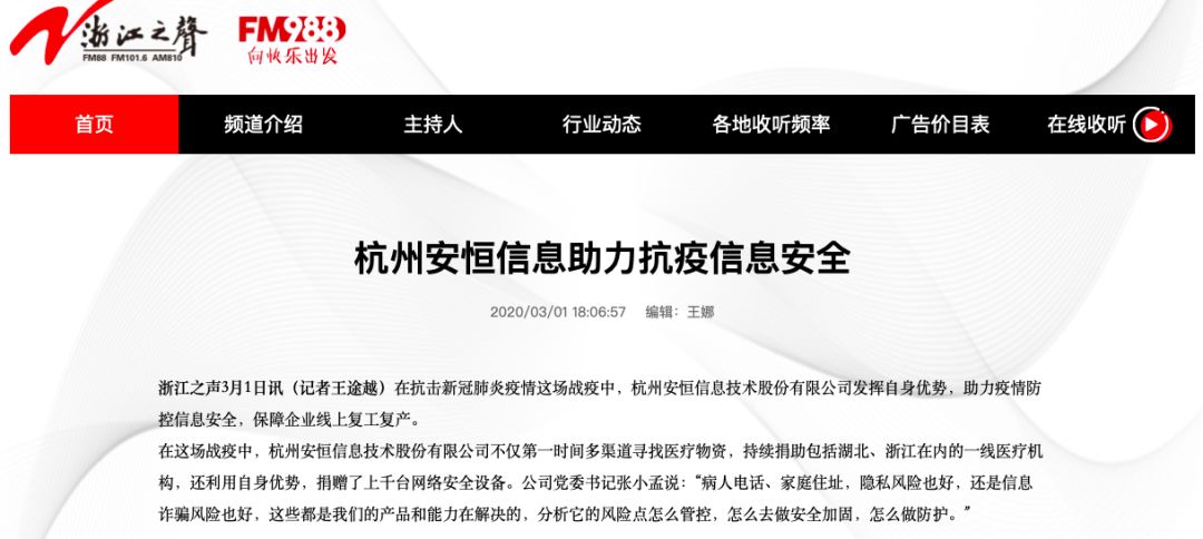 浙江之声:杭州安恒信息助力抗疫信息安全