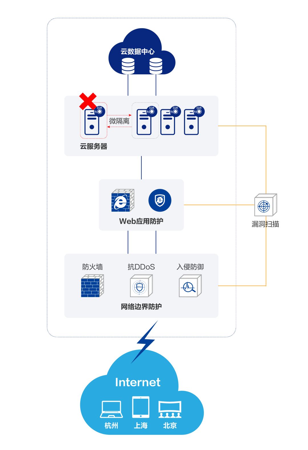 类比:云安全也需要“隔离防范”。在云安全建设中,云平台内部的业务系统和云上资产数众多且复杂,一旦发生安全事件,将会在内部迅速蔓延。因此,需要对云内的业务系统和重要资产进行严格的管理,加强云内各类型业务资产的安全管理和微隔离防控很重要。