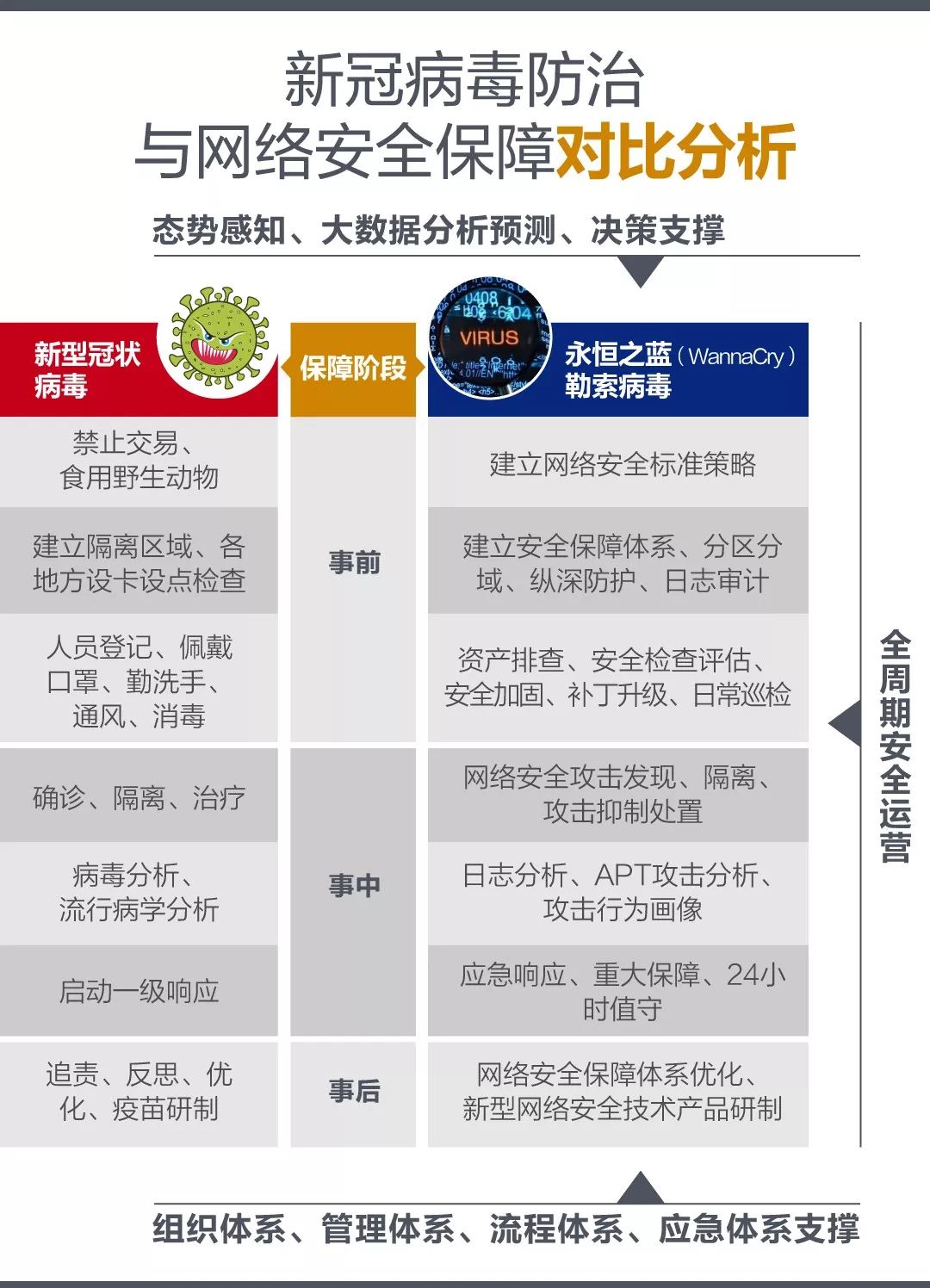 近来,新型冠状病毒疫情从武汉蔓延至全国,波及全球多个国家。关于新型冠状病毒的致病机理、传播途径、爆发背景等不断被分析和还原,防控措施也随之不断升级。站在大视角下看,新冠病毒与网络安全攻击尤其是勒索病毒相似或者相近,新冠病毒的检测、预防、控制、隔离、治疗方式和手段与网络安全防治思路也大体趋同,研究它们的异同点和规律性,无疑有积极的借鉴意义和启发作用。