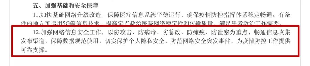 通知强调了,要从强化数据采集分析、积极开展远程医疗服务、规范互联网诊疗咨询服务、深化“互联网+”政务服务、加强基础和安全保障五个方面加强信息化支撑疫情防控工作。其中第12条明确指示,“加强网络信息安全工作,以防攻击、防病毒、防篡改、防瘫痪、防泄密为重点,畅通信息收集发布渠道,保障数据规范使用,切实保护个人隐私安全,防范网络安全突发事件,为疫情防控工作提供可靠支撑。”