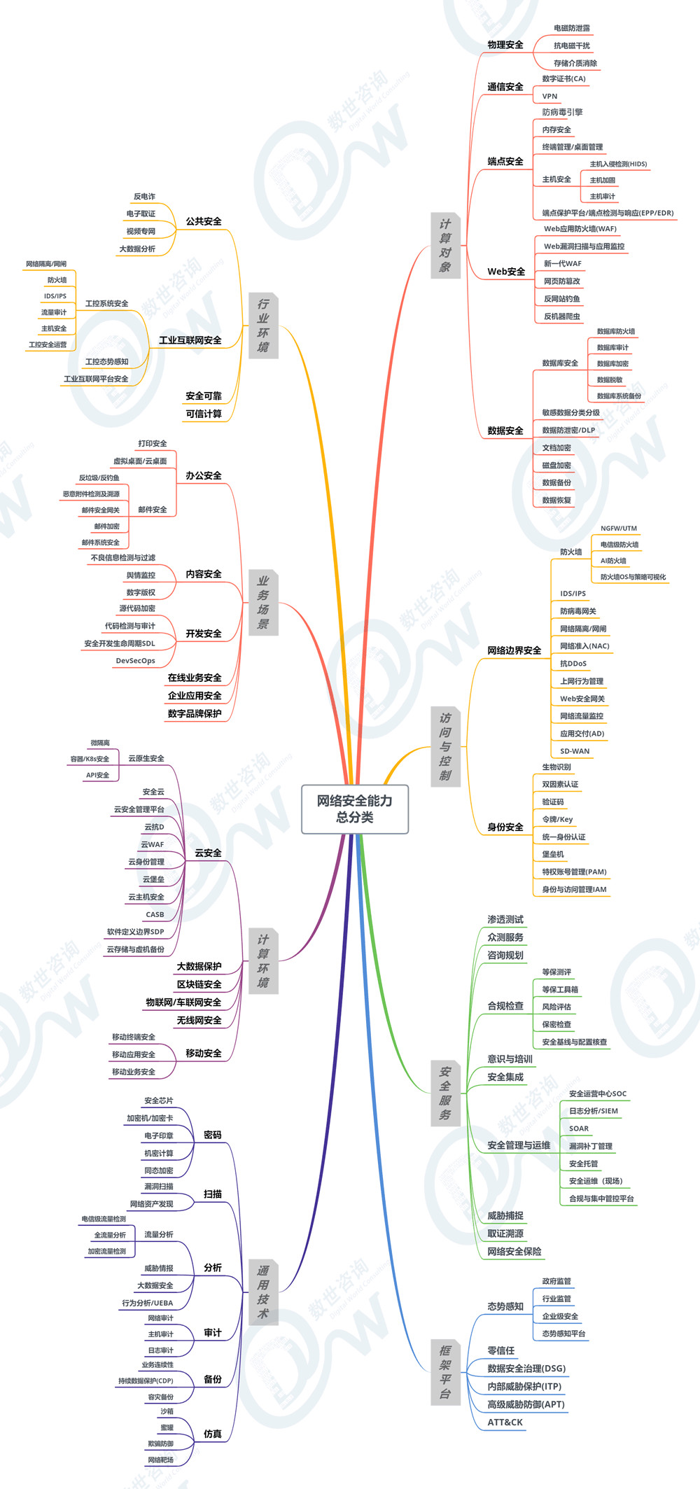 1月12日,中国数字产业领域第三方调研机构数世咨询发布《中国网络安全能力图谱(2020年1月)》。此次发布的“安全能力图谱”把安全能力划分成8个领域、45个一级分类、111个二级分类与24个三级。